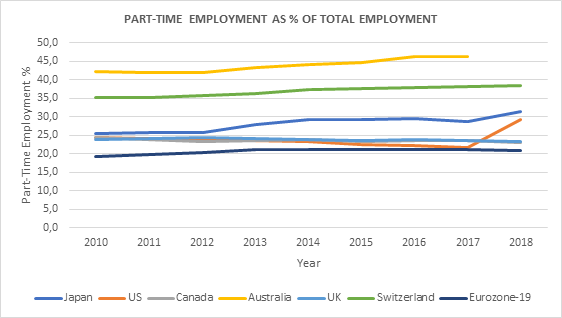 For example, in Australia the youth only works under part-time employment, while in Canada and in the US more than 95% and 85% respectively of their youth work under the part-time regime. In Japan, 50% of their youth work under part-time employment. The corresponding figure in the Eurozone-19 reaches 33% as a way of youth employment.