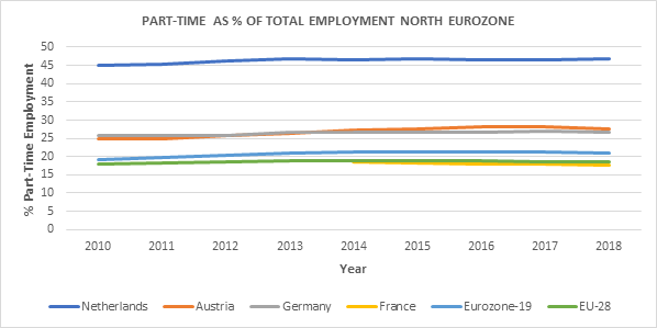 In the above graph we see that part-time employment in the workforce (25-64 years) for the North Eurozone and the EU respectively holds a higher percentage than the Euro-19 and EU-28 average (excluding France which is gradually approaching European average).