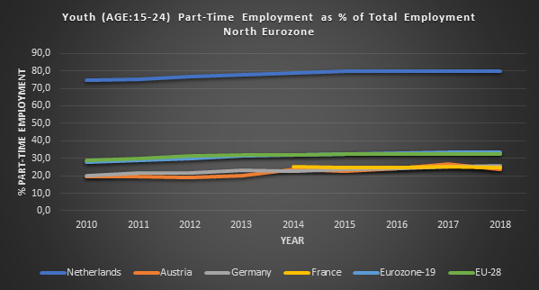 The corresponding part-time employment rates for youth are overwhelmingly high for the Netherlands (> 80%) while for the rest of the member-countries it is almost 1/3 as a form of youth employment (see graph below).