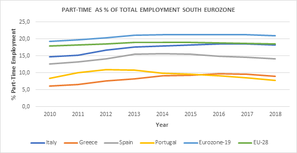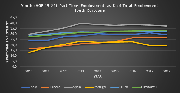 However, the corresponding part-time employment rates for youth for the Southern Eurozone member-countries soared to high heights due to the financial crisis of 2008, where in some cases they arrived at 42% (Spain) as a way of working for youth on of its overall way of employment (see the diagram below).