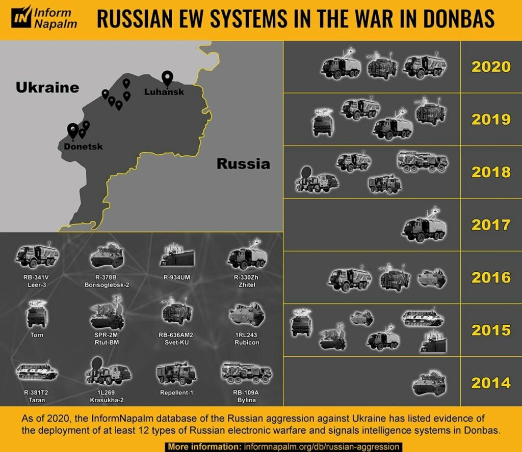 The development of Russian Electronic/Warfare systems included systems such as the TORN and SB-636 Svet-KU SIGINT stations which revealed the positions of Ukrainian units by eavesdropping, systems such as the RB-341V Leer-3s which combine Orlan-10 drones carrying jamming equipment, with a KamAZ-5350 truck-mounted control station, R-934B Sinitsa and R-330Zh Zhitels jammers that jam and block satellite signals.