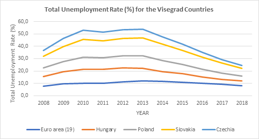 We are again seeing that unemployment in all four countries of the Visegrad group has steadily been decrease since 2013 and are likely to converge in the coming years with the average annual unemployment rate presented by the Eurozone-19.