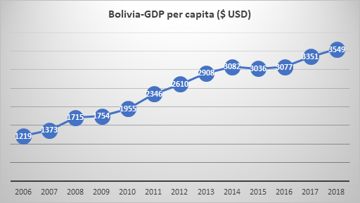 Evo Morales left Bolivia’s economy at good levels since for 2019 the Bolivian economy has a trade surplus of 74,76m (USD), annual inflation rate 2,54%, unemployment 4% and Government Debt to GDP 34%. (Data: Trading economics).