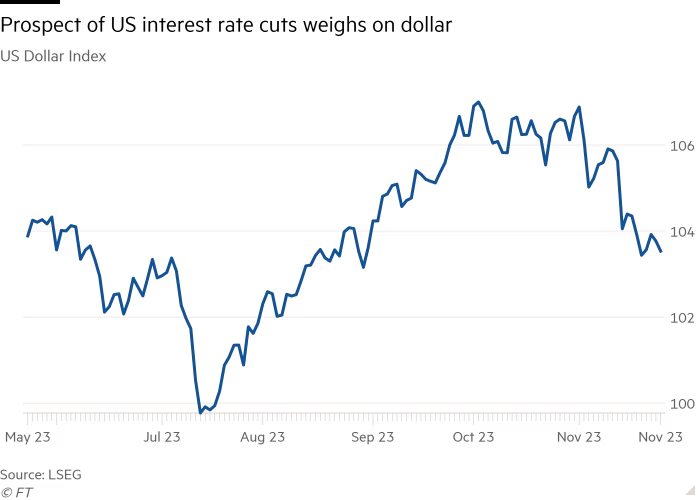 US inflation fell more than expected in October to 3.2%, prompting investors to reconsider any prospect of further rate hikes. Recent weakness has left the dollar roughly where it started this year, and futures markets are now discounting rate cuts of 0.5 percentage points by September next year.