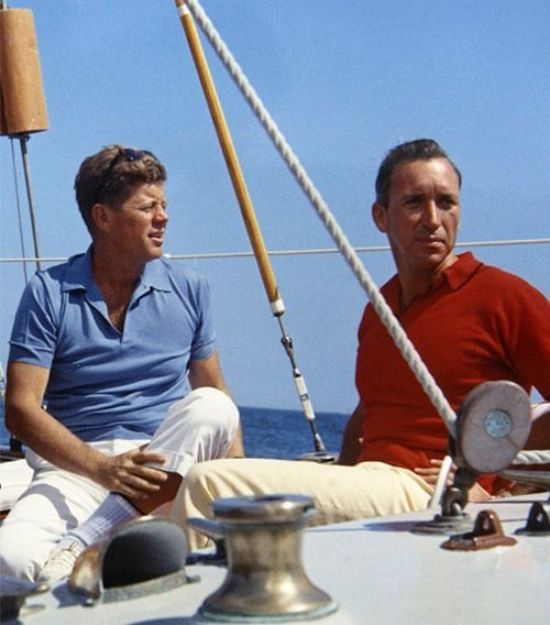 Outside the presidential palace JFK, who loved the water and sailing, frequently saying that “we have salt in our blood, in our sweat and in our tears, we are bound to the ocean” wore thin sweaters, gray sweatshirts, navy cardigans and of course polo shirts in all shades of blue and more.