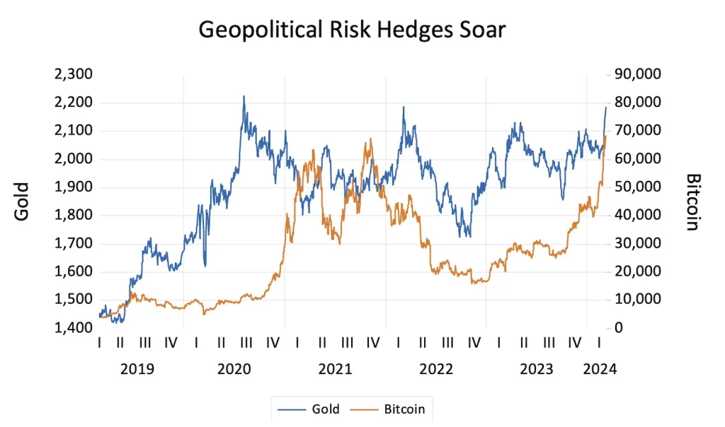 Investors, watching dark clouds loom over the global economy due to ongoing geopolitical upheavals, are hedging: Gold continued to break record prices on Friday, March 8, trading at $2,183 an ounce, and this was accompanied by from a more dramatic Bitcoin rally. Gold outperformed Bitcoin in 2020 and 2021, during the Covid crisis. This time Bitcoin clearly outperformed gold, suggesting that investors have more confidence in this form of crypto-value.