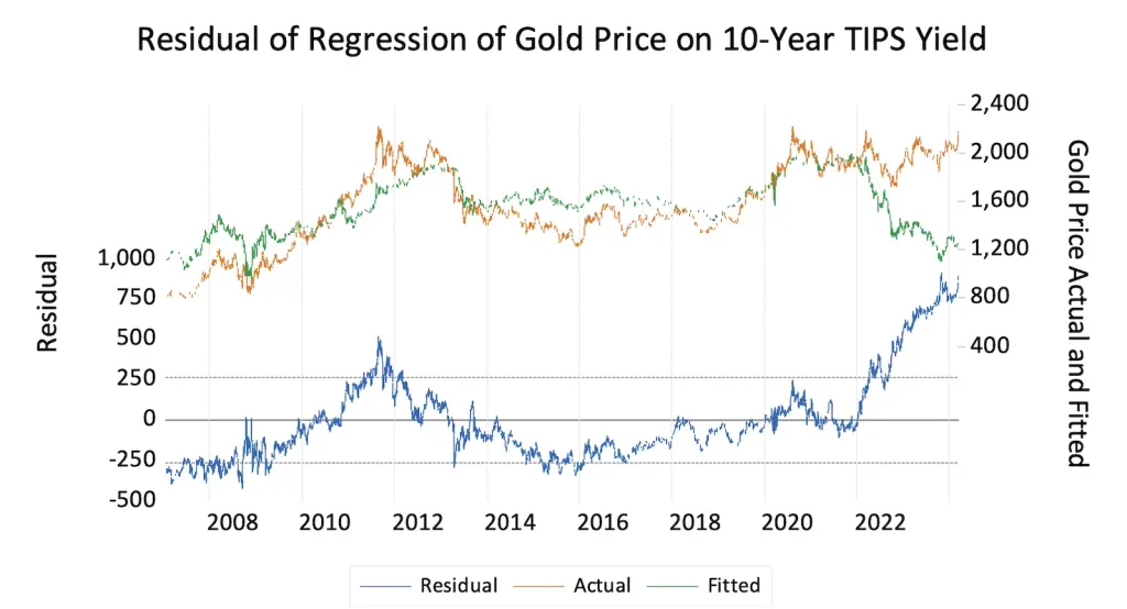 Both are hedges against an unexpected rise in inflation or a devaluation of the dollar. From 2007 to 2022, the price of gold moved steadily relative to TIPS yields, as investors used them interchangeably between the two assets.