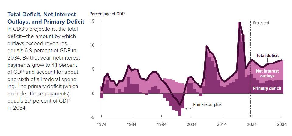 “The 2024 deficit will represent 7% of US gross domestic product while the 2034 deficit will be 6.9% of GDP,” the nonpartisan Congressional Budget Office (CBO) wrote in its latest report.