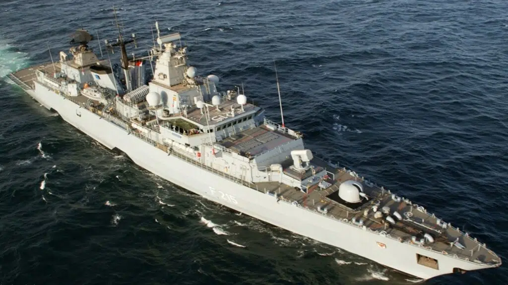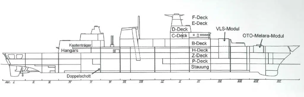 The main armament consists of one Compatto 76/62 gun in the bow. The Compatto gun is dual-role, 76 mm caliber and fires 6.5 kg projectiles at a maximum distance of 16,000 meters. Two Mk41 Mod 3 vertical rocket launchers with 16 bays for ESSM medium-range anti-aircraft missiles. ESSMs have a maximum range of 50 km and a speed of mach 4+. For incoming missile defense the frigate has two CIWS Mk49 RAM systems of 21 missiles each mounted, one between the main gun and MK41 launchers in the bow and the other above the helicopter hangar. Against surface ships it has two quadruple MK141 launchers for AGM-84D Harpoon missiles which replaced the two twin launchers for MM38 Exocet missiles mounted in the middeck. The German Navy is investigating replacing the AGM-84D Harpoon with SAAB’s newer and more capable RBS-15 MK3s during a mid-life upgrade the ships are currently undergoing. Two twin Mk32 torpedo tubes for MK46 or MU-90 light anti-submarine torpedoes are located starboard and port amidships on “B” Deck. It also has two Mauser 27mm gun stations. The last line of defense is the MASS airfoil launcher systems.