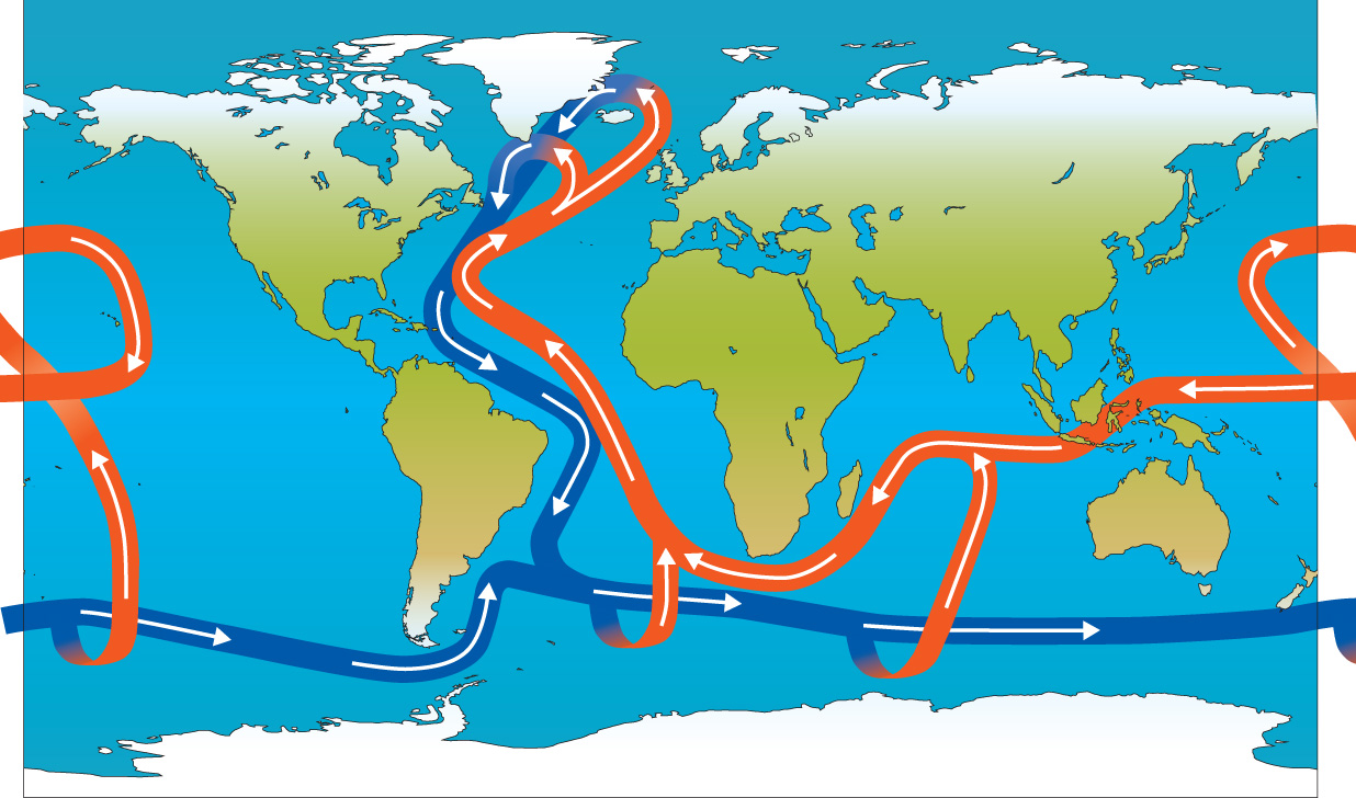 Like a (airport) conveyor belt, the AMOC pulls warm surface water from the Southern Hemisphere and the tropics and distributes it into the cold North Atlantic. The cooler, saltier water then sinks and flows south. This mechanism prevents parts of the Southern Hemisphere from overheating and parts of the Northern Hemisphere from freezing, while distributing life-sustaining nutrients to marine ecosystems.