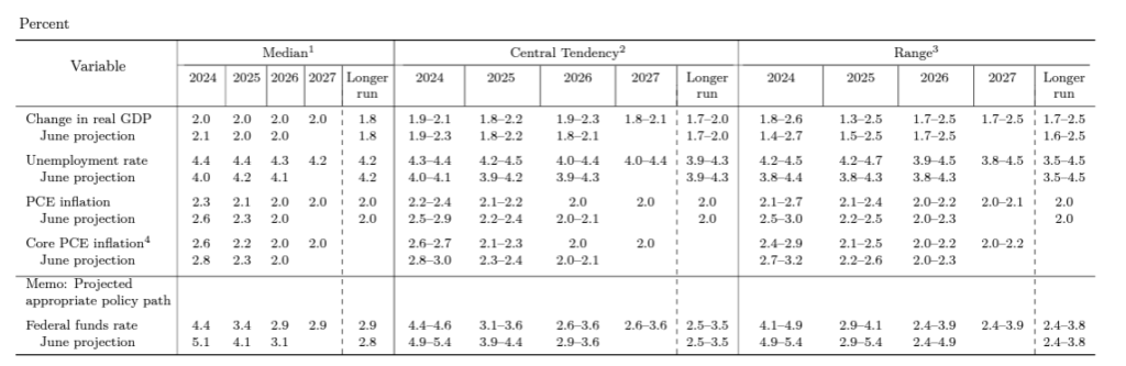 As far as economic forecasts for the US are concerned, as can be seen in the table below, the Fed revised its estimates for economic growth and unemployment in the US in 2024 to 2% (from 2.1%) and 4, 4% (against forecasts for unemployment of 4% at the end of this year) respectively.
