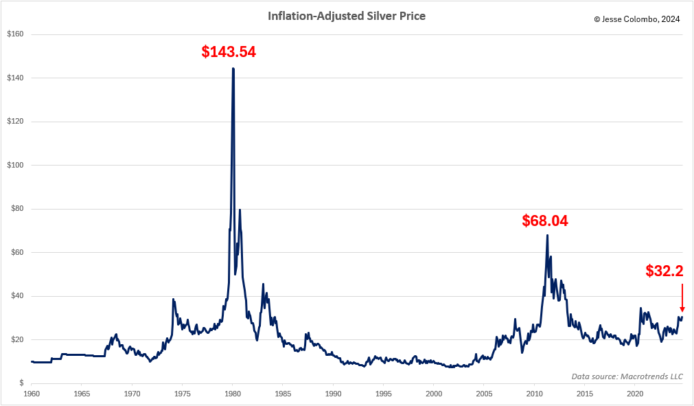 Currently trading at just $32.20, silver has significant upside if it is to match those previous inflation-adjusted highs.