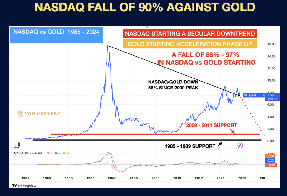 The price-to-earnings ratio for Nasdaq stocks is 49 times. A decline of at least 80%, like in the early 2000s, is likely.