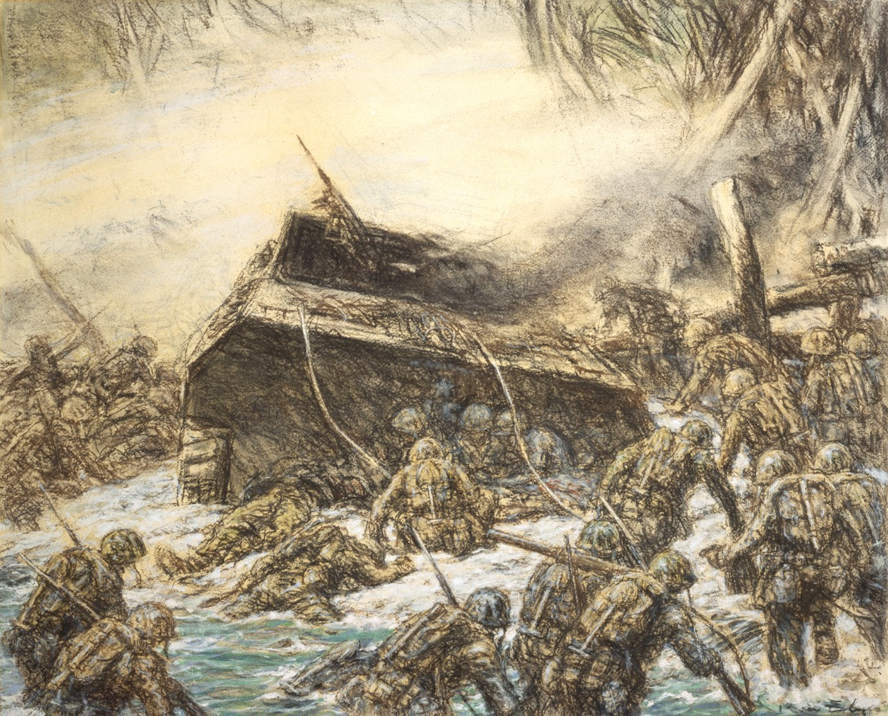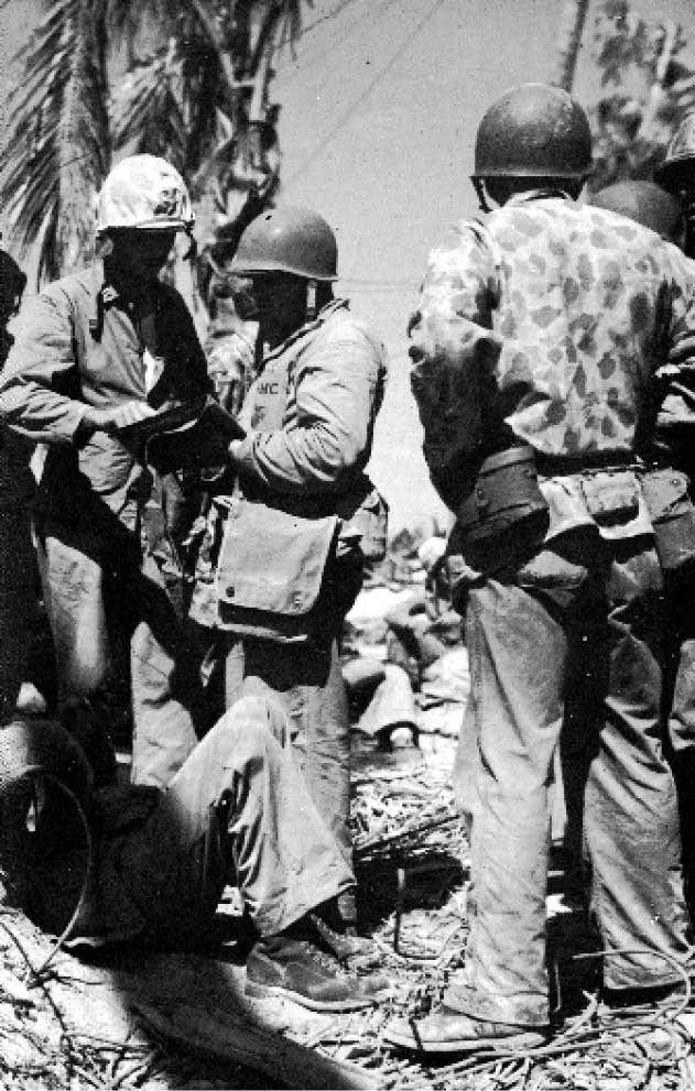 Company E was pinned down a few yards from the shore, Company F lost half its strength just reaching it, and Company G, also suffering heavy casualties, was pinned between the sea and the Japanese log barrier on the shore. There was no shortage of heroics as the desperate Marines tried to force a way through the enemy fortifications.