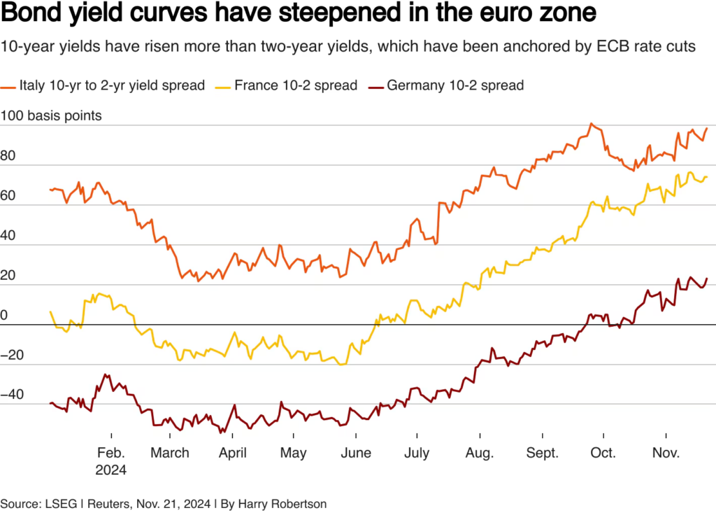 3. Αt the same time, rising political risk in Europe — with the collapse of the ruling coalition in Germany leading to elections next month and turmoil in France, which is operating on an emergency budget (it has not been approved by the legislature amid disagreements) — has accelerated gross government bond sales, analysts said. French bonds recorded the largest sales during the period, at 26 billion euros.