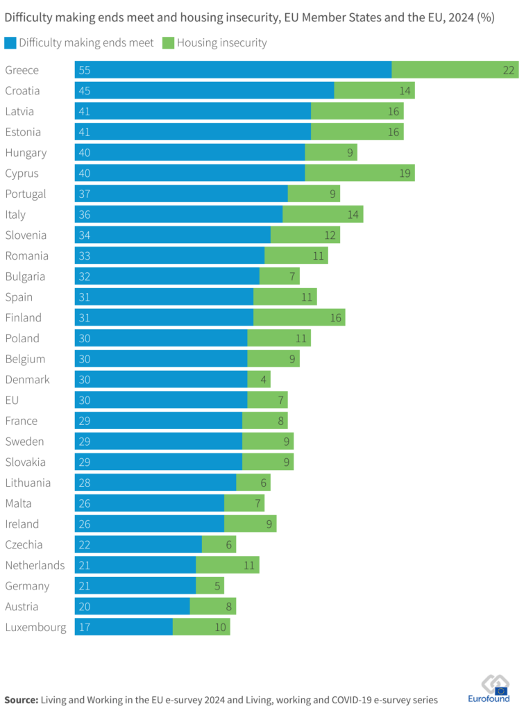 Among the Member States, Greece has by far the highest proportion of those struggling to make ends meet, at 55%. This is followed by Croatia with 45% and Estonia and Latvia with 41%. The European average is also high, with three in ten households struggling to make ends meet.