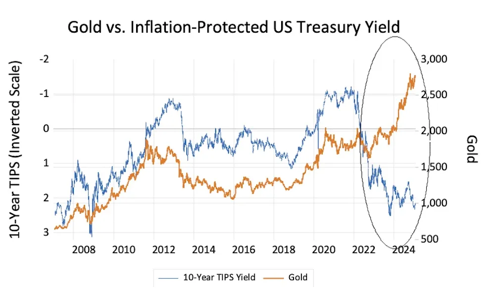 However, gold became decoupled from TIPS yields in March 2022, after the US and its allies seized $300 billion of Russian foreign exchange reserves. An asset that can be seized at will by a buyer is less attractive than gold stored in a central bank’s vaults.