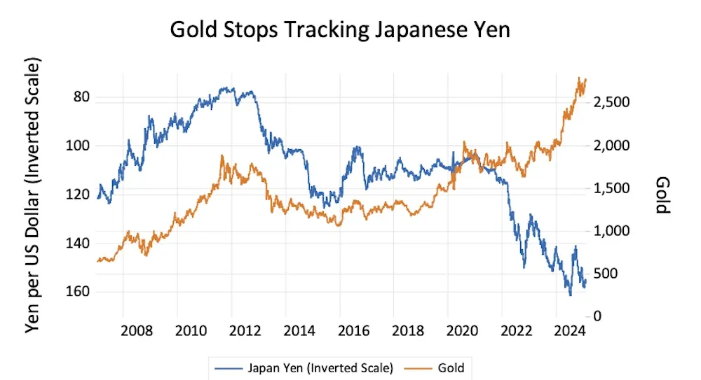 3. Other currencies used to act as hedges against the dollar. The price of gold has broadly tracked the Japanese yen, an alternative to the dollar. But that relationship also broke down in 2022. Because