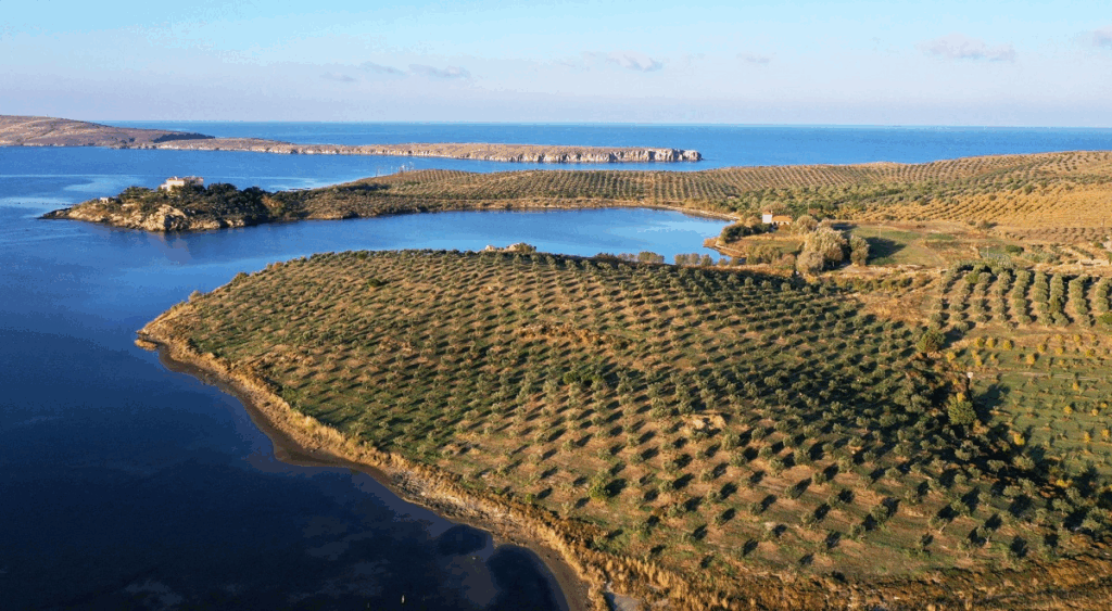 In an area of 2,000 acres, between the rocks, the beaches and the hills, 40,000 olive trees are cultivated – without violent interventions in the natural relief, with linear planting, while the 20,000 different species of trees that surround it function as reinforcements, not only for beautification, but mainly for the protection and strengthening of biodiversity. In the olive grove of the Faros estate, 12 different species of olive trees are cultivated from local, Greek and international varieties such as: Adramyttini, Kolovi, Koroneiki, Kalamon, Halkidiki, Mavroelia, Arbequina, Frantoio, Leccino, Aricombi, Picual and Melolia.
