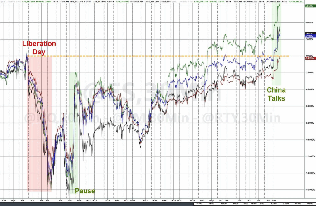With “significant progress” being made in US-China trade talks, including the announcement of a temporary 90-day “haircut” on tariffs, exceeding even the most optimistic expectations (with each country reducing its tariffs by 115%, i.e. the US reducing from 145% to 30% and China from 125% to 10%), US Treasury Secretary Bessent said that neither side wants to “disengage” the other.