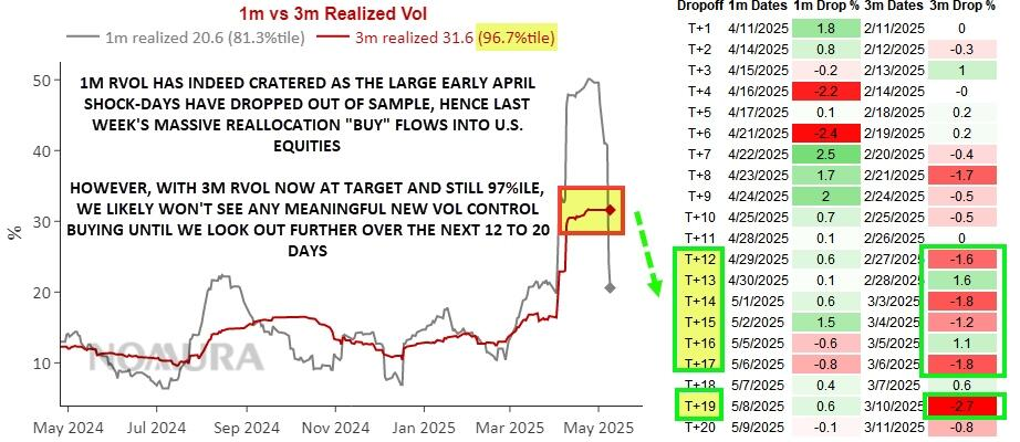 From a flow perspective, we spent a significant amount of time discussing the impending “buy” repositioning flows from Volatility Control funds into equities, due to the decline in Realized Vol, as the large extreme sessions since early April have been excluded from the calculation horizon over the past week and a half.