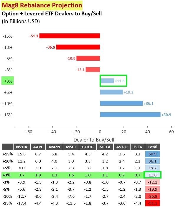 Based on today’s “+3%” upside projection to close, it is estimated that there will be +30.9 billion $ of hedging purchases by Options Dealers in indices and leveraged ETFs, as well as an additional +$11.8 billion in implied purchases in individual Mag8 stocks — with a cumulative estimate of +$42.7 billion in additional buying flows today.
