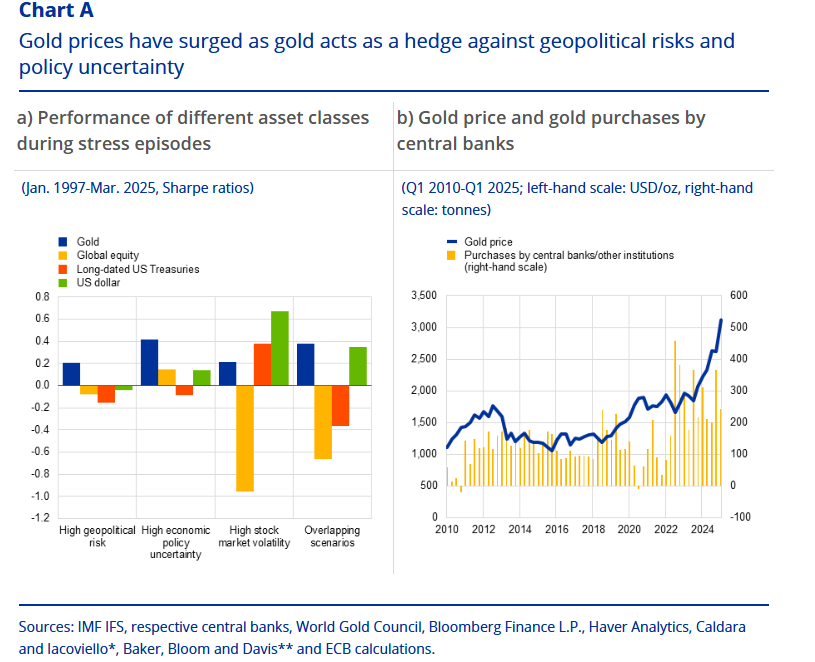 In this context, the ECB analyses the performance of gold during periods of stress, as well as developments in gold derivatives markets, with a view to assessing risk perceptions and assessing the implications for financial stability. ECB note by Maurizio Michael Habib, Oscar Schwartz Blicke, Emilio Siciliano and Jonas Wendelborn of the bank: (“What does the record price of gold tell us about risk perceptions in financial markets?“).