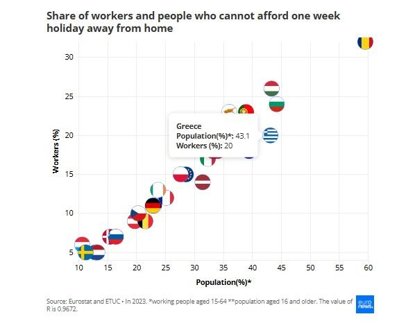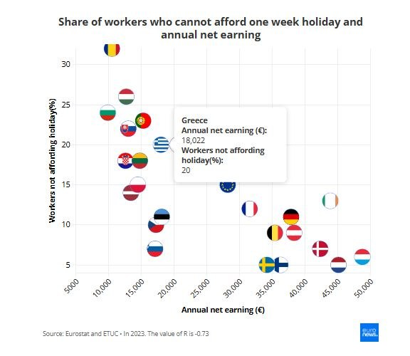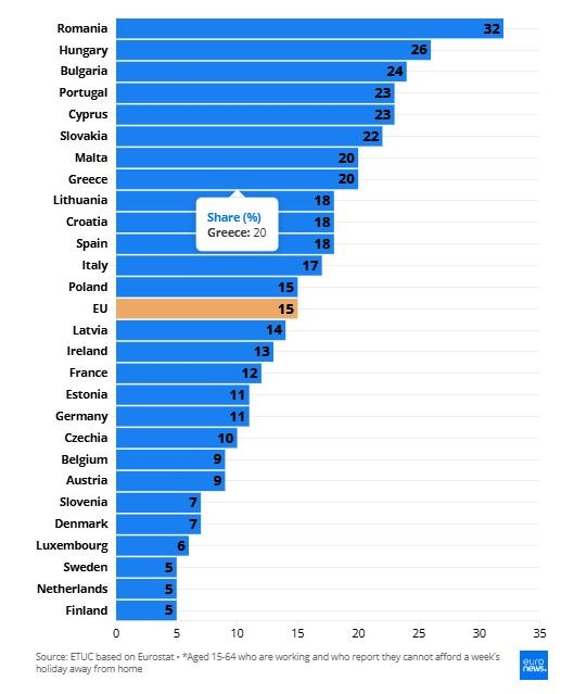 In Greece, 20% of workers cannot afford a week’s holiday – with the country six places above the EU average (15%).