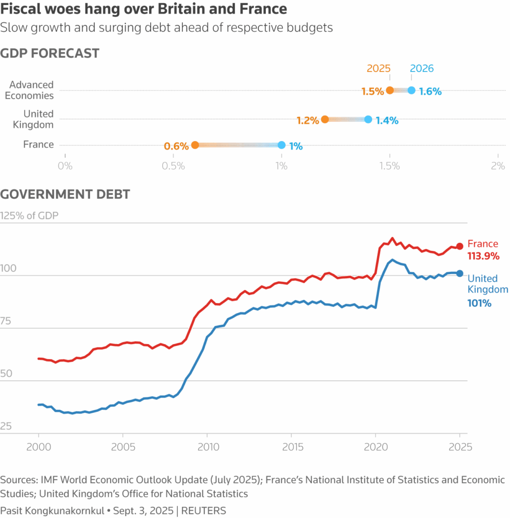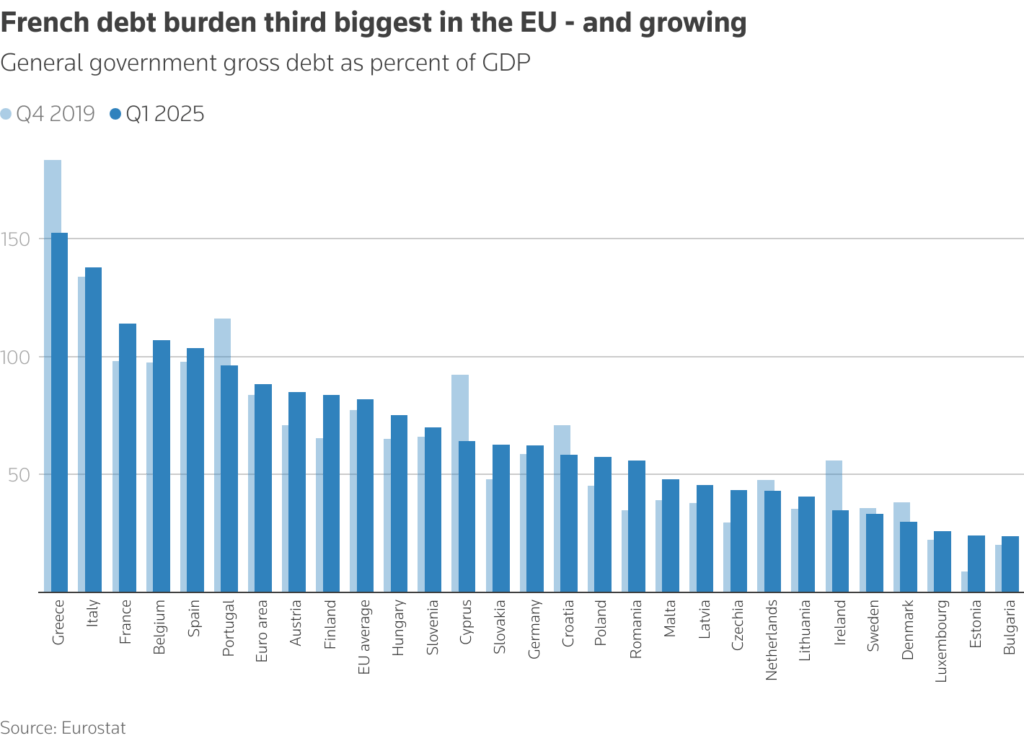 France has shot to the top of the list of concerns. Opposition parties this week ousted center-right Prime Minister Francois Bayrou over his unpopular plans for 44 billion euros in fiscal austerity as debt has surged past 3 trillion euros.