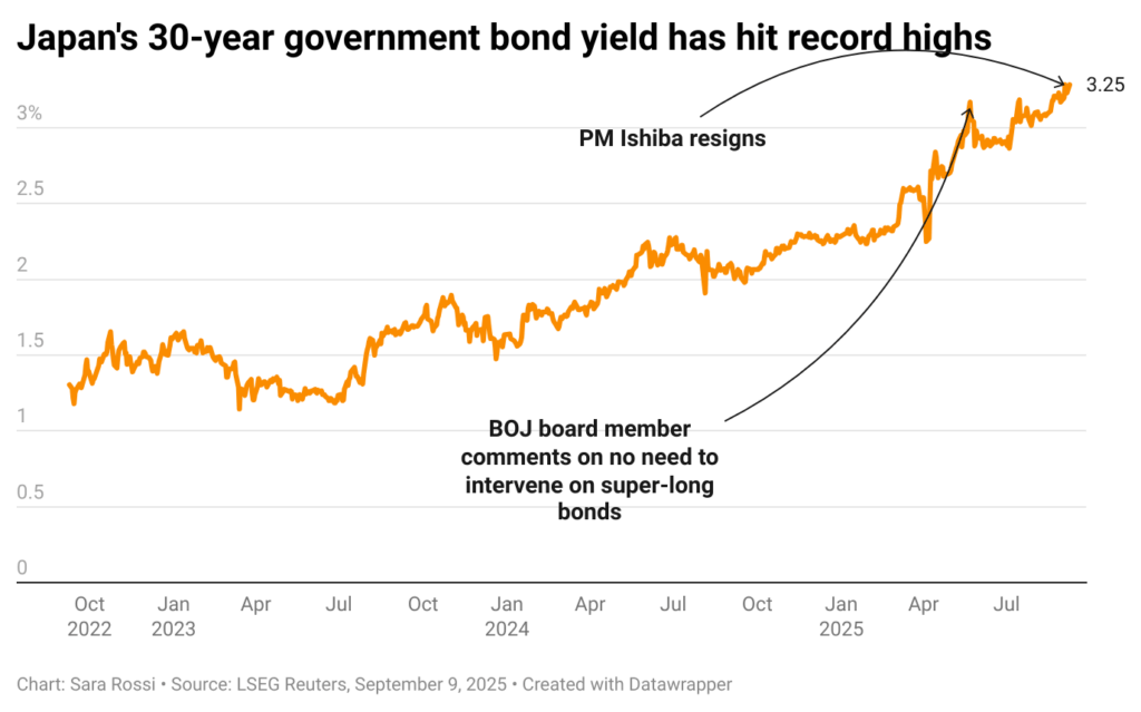 Political uncertainty following the resignation of Prime Minister Shigeru Ishiba has also helped push 30-year bond yields to record highs as speculation grows that his successor will spend more.