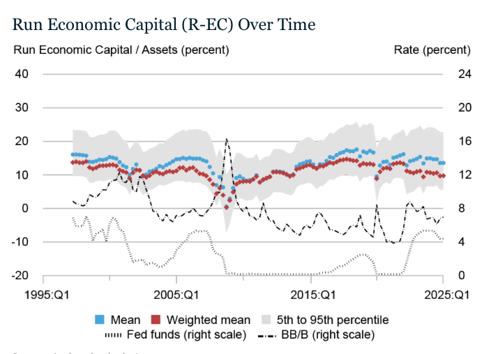 The study introduces a new, more forward-looking measure of solvency – the economic capital measure – that is more up-to-date and comprehensive than the measures most commonly used to measure solvency. Instead of focusing on accounting capital, the Fed estimates economic capital – which makes more sense from a risk management perspective.