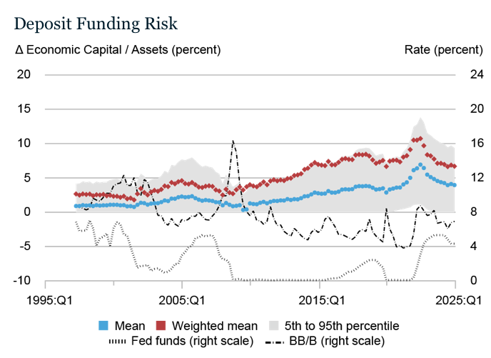 Furthermore, deposit funding risk at larger banks has increased significantly as they have increased their reliance on uninsured deposits. Therefore, with a more forward-looking, more accurate and more comprehensive indicator such as economic capital, large banks are not better capitalized than before the crisis, and furthermore face higher deposit risk.