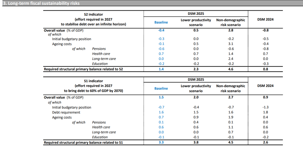 The decline in the debt-to-GDP ratio is due to the (uncertain to note…) assumption of a structural primary surplus of 1.8% of GDP from 2026 onwards, excluding changes in the cost of population ageing.