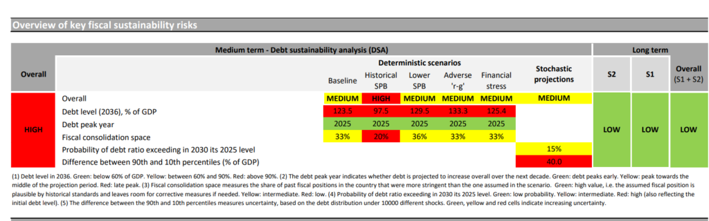 According to the baseline scenario of the European Commission’s Debt Sustainability Analysis (DSA), public debt is projected to decline but remain high in the medium term, reaching around 124% of GDP in 2036.