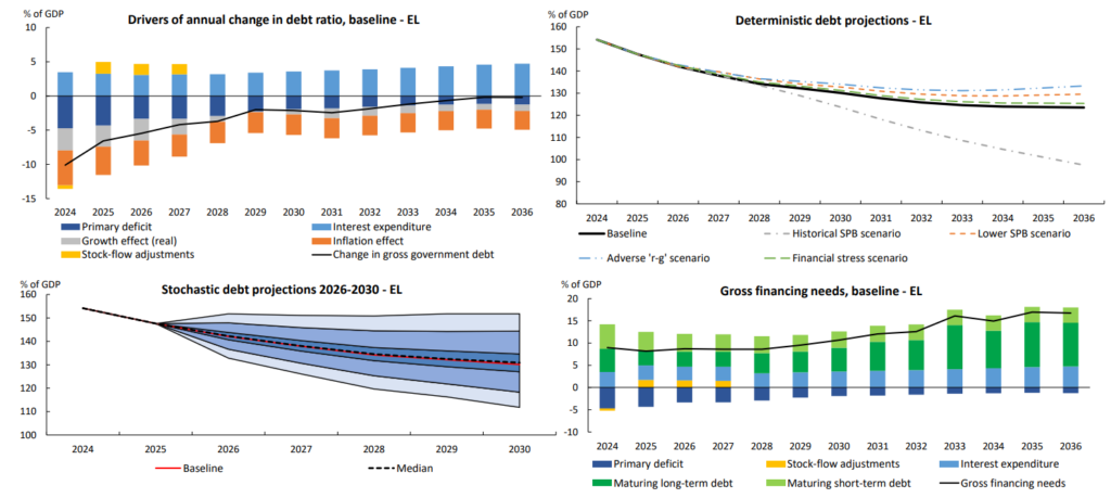 The European Commission’s study on the sustainability of the debt of its member states (Debt Sustainability Monitor 2025) predicts for Greece that its public debt will remain more than double the Maastricht limit of 60% in the medium term (at 124% of GDP in 2036).