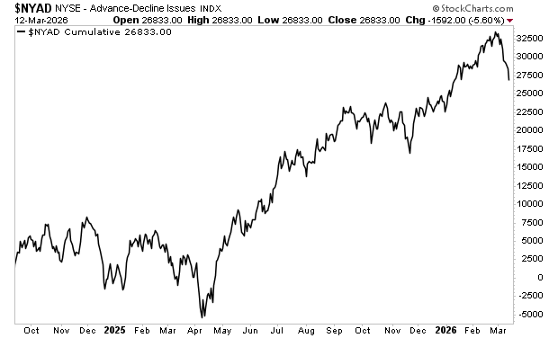 The logic is that when the rise is not limited to a few large companies but involves a large part of the market, then the bull market is considered more stable and durable. However, according to the analysis, this picture has changed dramatically. Market breadth has collapsed in recent weeks, erasing almost all of the gains recorded in 2026 and removing one of the main arguments for investors who argued that the market remains strong.