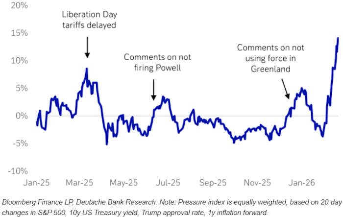 Maximilian Uleer and his team at Deutsche Bank have developed a simple and useful index of pressure on the president, a weighted measure that consists of four-week changes in the S&P 500 index, the 10-year U.S. Treasury yield, short-term inflation expectations, and the president’s popularity. The pressure is intense.